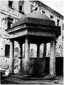 Sotto il suolo cerano due grandi cisterne fatte scavare dai Padri del Comune, che servivano come serbatoi dellacqua nel caso ci fosse un assedio alla città. Dopo anni di abbandono, una delle due cisterne fu riattivata, utilizzandola come fontana. Sopra il pozzo scoperto fu edificato un tempietto (sotto nella foto dei primi anni 70), disegnato da Bartolomeo Bianco, sulla cupola del quale venne posto il busto del Giano bifronte.